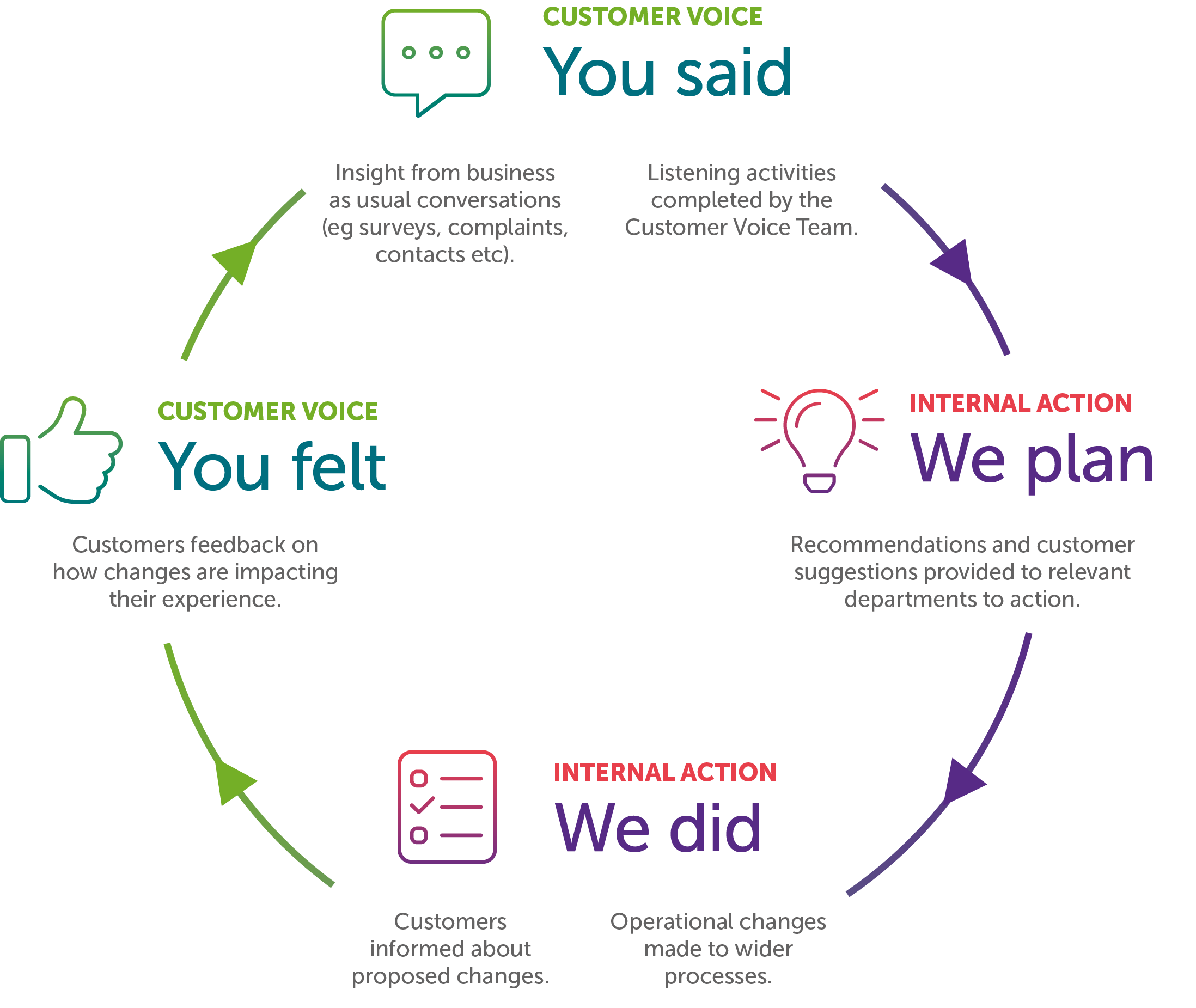 - Regularly report on how we’re using customer voice to shape services through ‘You said, we did’ examples and on the customer voice hub.