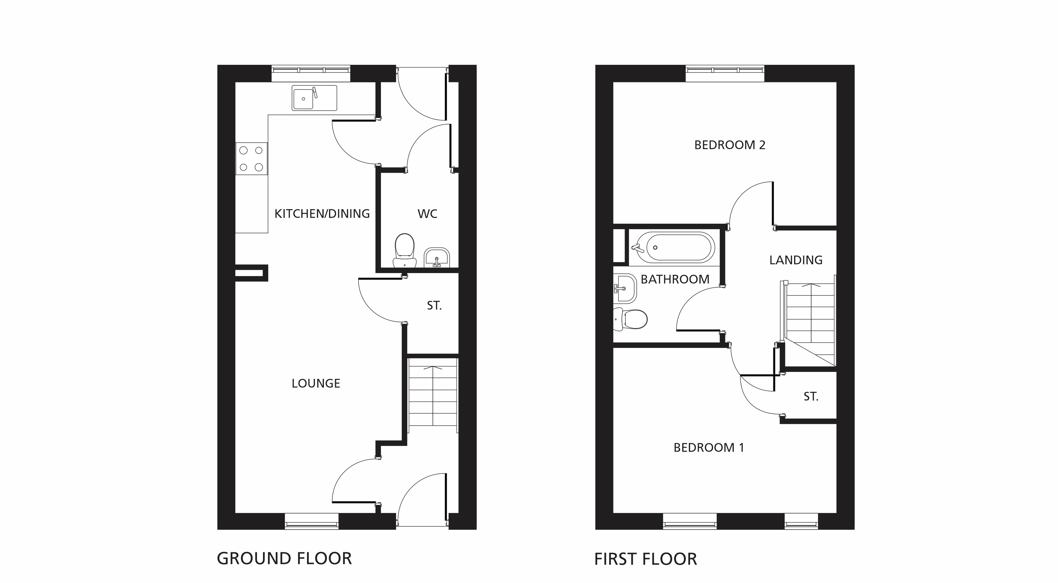 The front door of this home opens on to the hall, which then leads to the spacious lounge. From there, is the modern kitchen/dining room, with its built-in oven, hob and hood and the back door opeing onto the rear enclosed garden, which will be freshly turfed. The ground floor also boasts a downstairs WC.Â