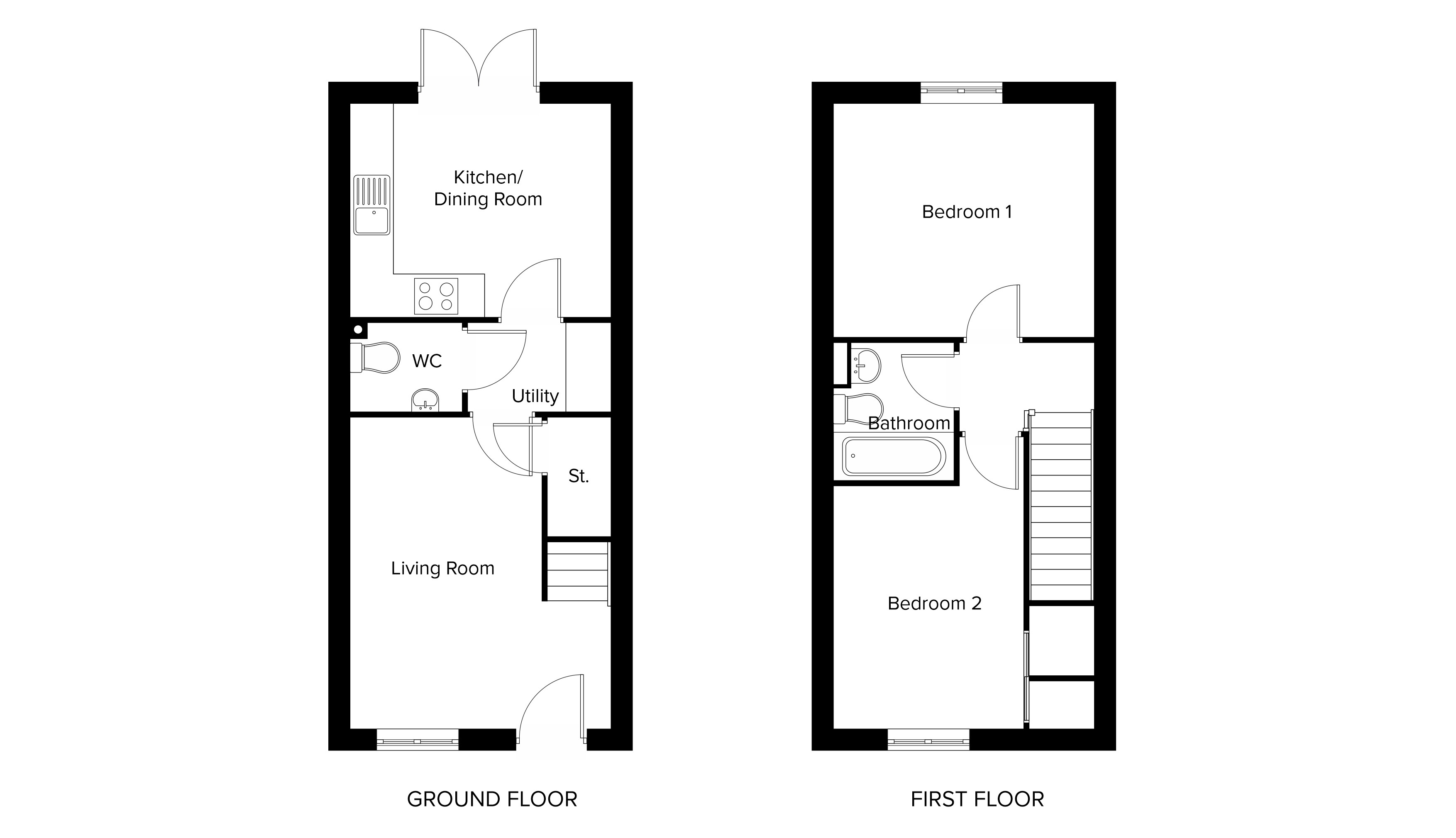 The front door of this home opens on to the spacious living room. From there is the modern kitchen/dining room, with its built-in oven, hob and hood. There is also French doors that open onto the rear enclosed garden, which will be freshly turfed. The ground floor also boasts a downstairs WC and a utility room.Â