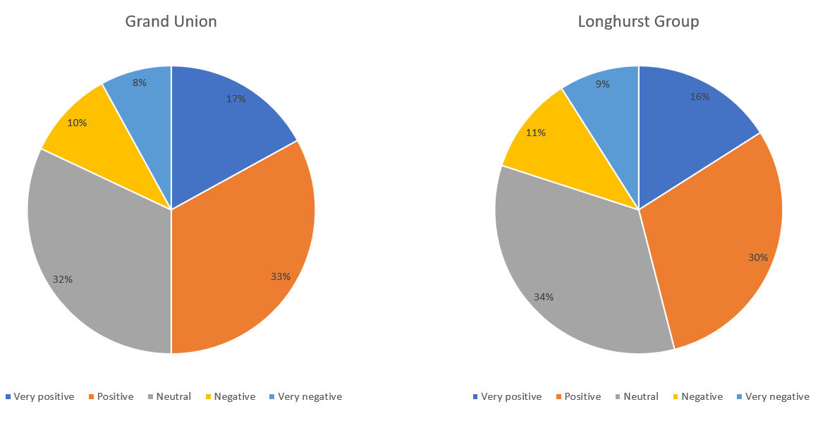 In total, 47 percent of all feedback from customers of both organisations was positive or very positive, with only 19 percent negative or very negative. The remaining 34% of feedback was neutral.